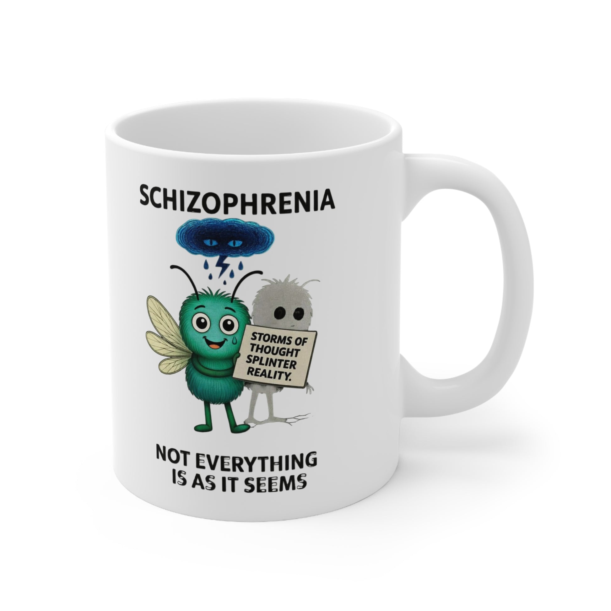 Start your day with Echo, the Storm Mosquito who represents Schizophrenia. Voices twist, shadows blur, and the mind can feel like an echo chamber — but Echo reminds us that compassion and understanding are powerful allies. This mental health awareness mug is a daily symbol of empathy, resilience, and the fight to break stigma.