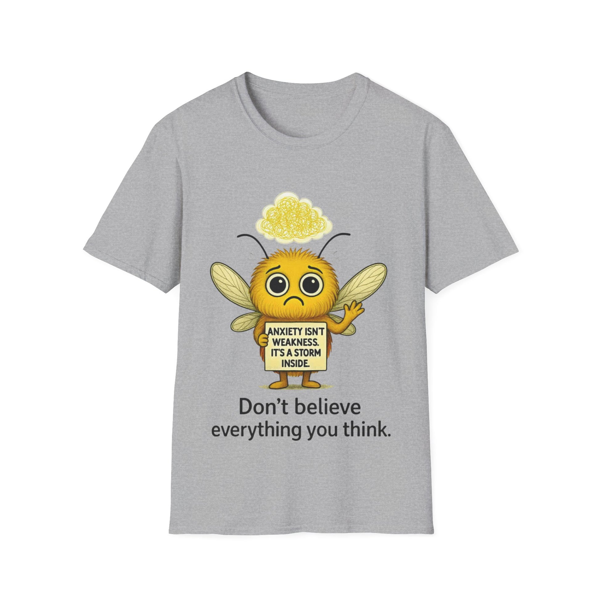 Nelly stands beneath a glowing yellow storm cloud, holding a sign that reads “Anxiety isn’t weakness, it’s a storm inside.” Beneath them, the words “Don’t believe everything you think” remind us that anxious thoughts are not truths — they’re weather patterns that always pass.