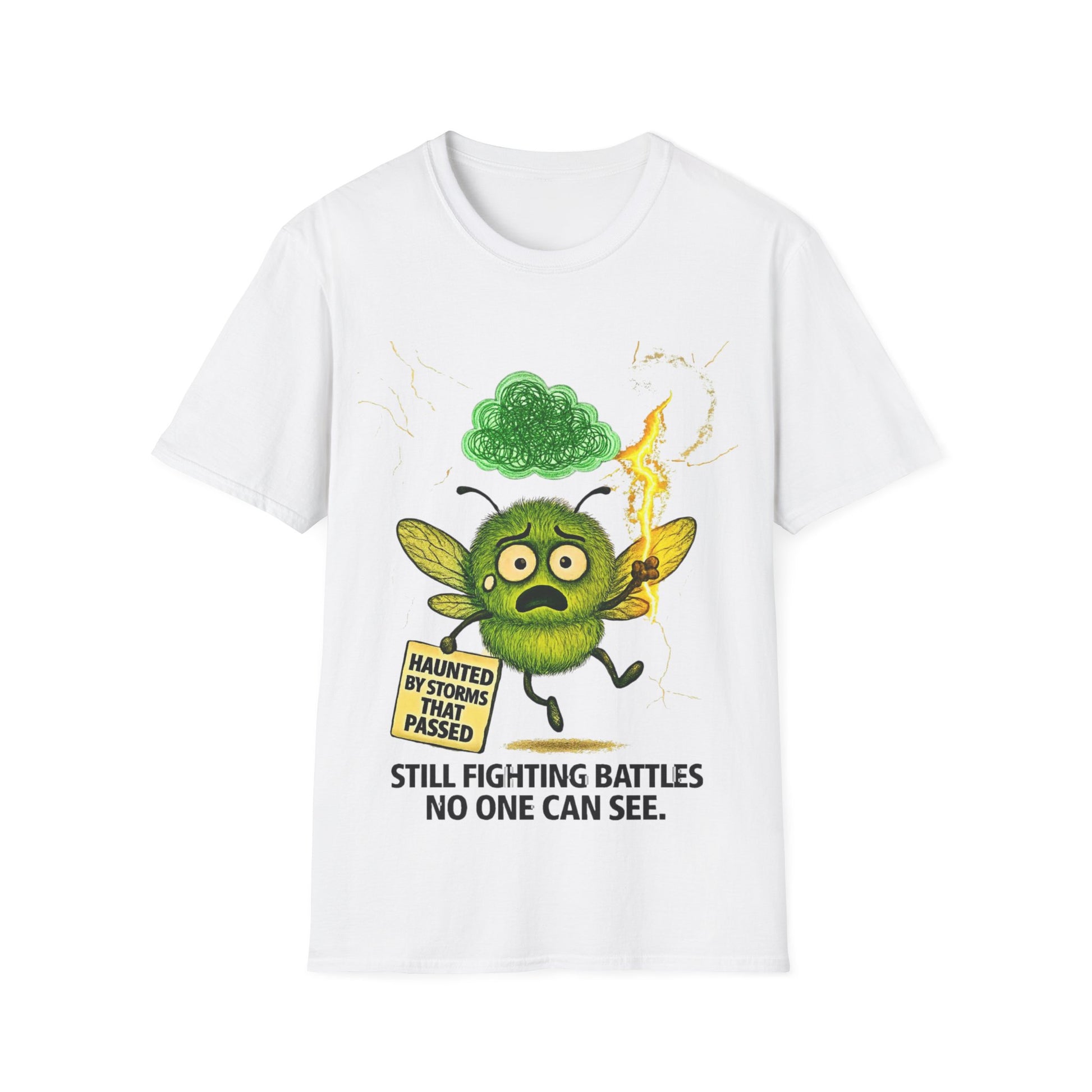 Hope stands beneath a vivid green storm cloud, clutching a sign that reads “Haunted by storms that passed.” Below, the words “Still fighting battles no one can see” remind us that invisible wounds can be just as real — and just as worthy of care — as the ones we can touch.