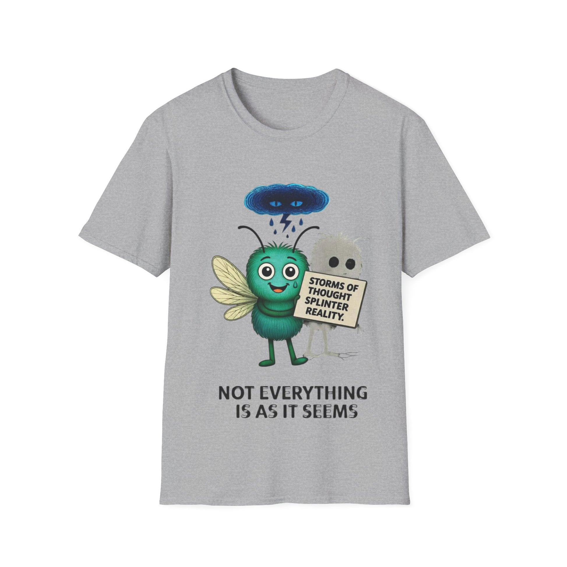 Echo stands beneath a dark blue storm cloud, holding a sign that reads “Storms of thought don’t always reflect reality.” Behind them, their faint shadow mirrors the blurred lines between what’s real and what’s imagined. Beneath it all, the words “Not Everything Is as It Seems” remind us that understanding grows from empathy, not assumption.